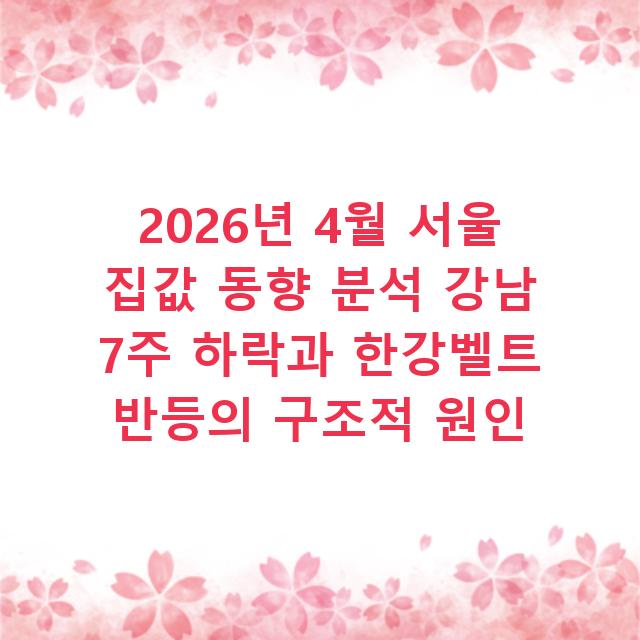 2026년 4월, 서울 부동산 시장은 하나의 도시 안에 두 개의 완전히 다른 이야기가 동시에 펼쳐지고 있죠. 한쪽에서는 강남, 서초, 송파의 아파트 가격이 7주째 꺾이고 있습니다. 반대편에서는 성동, 강동을 비롯한 한강벨트 지역의 가격이 오히려 고개를 들고 있네요. 단순한 등락률 비교를 넘어서, 이 극명한 대비가 말해주는 건 뭘까요. 표면적인 시장 소음 뒤에 숨어 있는, 정책이 개인의 자산 가치를 결정짓는 강력한 연결고리를 놓치고 있다면 큰 그림을 보기 어렵습니다. 한국부동산원의 주간 데이터와 정책 문건을 결합해, '왜 지금 강남만 떨어지는지'에 대한 구조적 답변과 이 변동성 속에서 실거주자와 자산 관리자가 취해야 할 전략적 사고를 제시합니다.