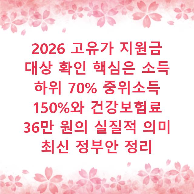 핵심 요약 1: 2026년 지원금 대상 ‘소득하위 70%’는 ‘기준 중위소득 150%’를 의미하며, 직장가입자 4인 가구 기준 월 건강보험료 약 36만 원 이하로 파악됩니다. 복잡한 소득 계산 대신 보험료 확인이 최단 경로입니다.